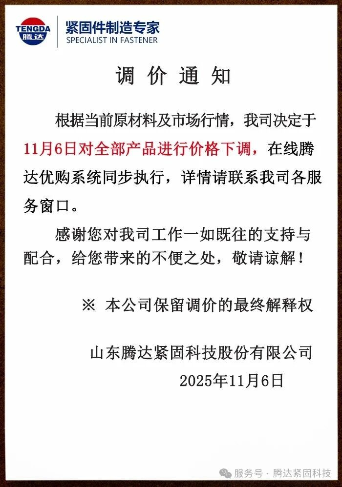 腾达科技11月6日发布调价通知:根据当前原材料及市场行情,公司决定于11月6日对全部产品进行价格下调,在线腾达优购系统同步执行。