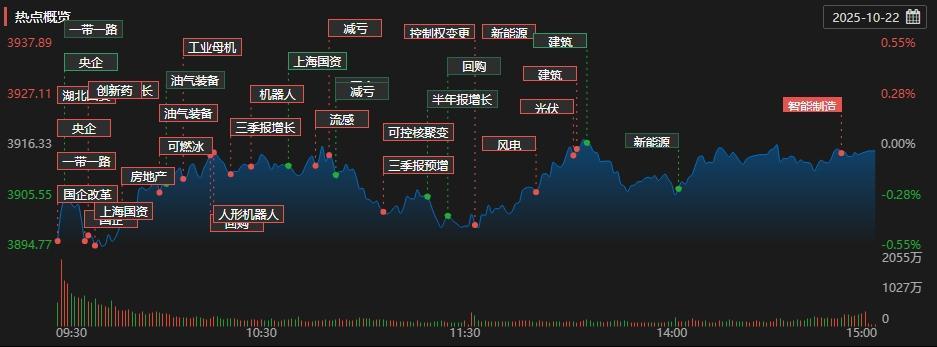 10月22日,A股延续震荡整理走势,三大指数早盘冲高后逐步回落,最终集体收跌。截至收盘,上证指数报2913.76点,下跌0.07%;深证成指跌0.62%,报12996.61点;创业板指跌0.79%,收于3059.32点。市场量能收缩态势显著,全市场总成交额16903亿元,较前一交易日缩量2024亿元,跌至近两个月次低位,投资者观望情绪明显升温。