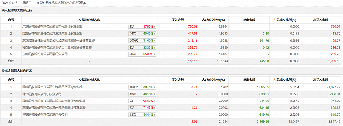 雪祺电气4月16日跌停,龙虎榜数据显示,上榜营业部席位全天成交6212.79万元,占当日总成交金额比例为29.3%。其中,买入金额为2197.25万元,卖出金额为4015.55万元,合计净卖出1818.3万元。