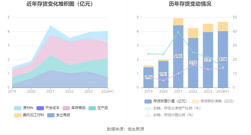 从存货变动来看,截至2024年上半年末,公司存货账面价值为4.04亿元,占净资产的14.98%,较上年末增加751.12万元。其中,存货跌价准备为6623.37万元,计提比例为14.07%。