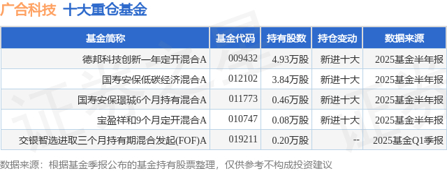 根据2025基金半年报公募基金重仓股数据,重仓该股的公募基金共4家,其中持有数量最多的公募基金为德邦基金的德邦科技创新一年定开混合A。德邦科技创新一年定开混合A目前规模为0.59亿元,最新净值1.2272(9月25日),较上一交易日下跌0.84%,近一年上涨117.32%。该公募基金现任基金经理为雷涛。雷涛在任的基金产品包括:德邦半导体产业混合发起式A,管理时间为2021年12月28日至今,期间收益率为93.74%;德邦稳盈增长灵活配置混合A,管理时间为2023年3月29日至今,期间收益率为-19.22%;德邦福鑫灵活配置混合A,管理时间为2023年10月13日至今,期间收益率为11.77%;
