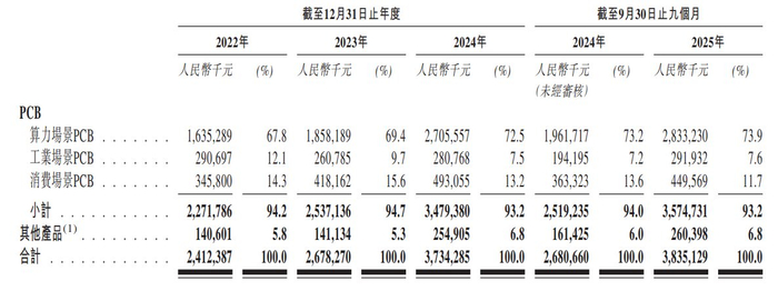 该公司PCB产品销售于算力场景、工业场景及消费场景,其中算力场景占需求大头,2022年至2025年前9月,收入份额分别为67.8%、69.4%、72.5%及73.9%,该场景收入保持双位数的复合增速;工业场景收入略有波动,但今年实现高增,前9月增长50.5%,收入份额7.6%;而消费场景收入增长相对稳健,前9月收入份额11.7%。