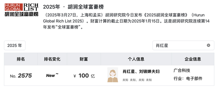 财富层面,肖红星、刘锦婵夫妇以100亿元财富位列《2025年胡润全球富豪榜》第2575名,肖红星成为当年唯一登上该榜单的孝感籍企业家,也被誉为“湖北孝感首富”。