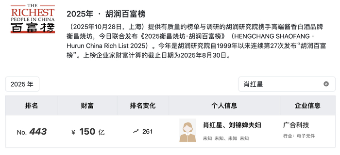 而在2025年10月28日发布的《2025胡润百富榜》中,这对夫妇的身家进一步攀升至150亿元,位列第443名。