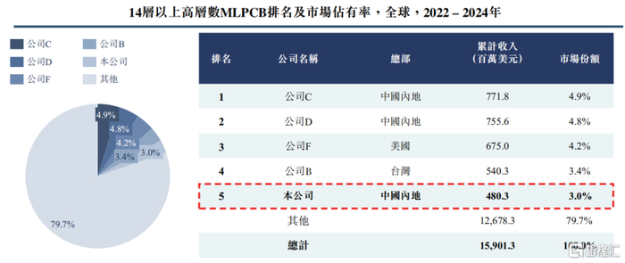 在全球高层数MLPCB(14层以上)市场中,按累计全球收入计,广合科技以480.3百万美元累计收入位居全球第五、中国内地PCB企业第三,市场份额为3.0%。