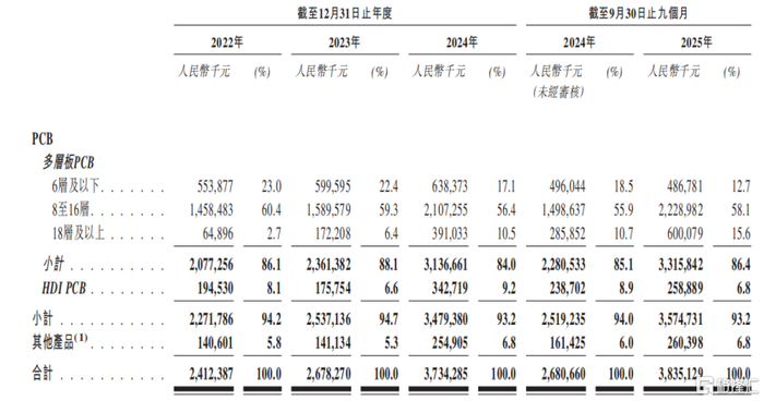 2022年、2023年、2024年及2025年1-9月(报告期),公司来自算力场景PCB的收入分别为16.35亿元、18.58亿元、27.06亿元、28.33亿元,占同期总收入的比重在70%左右。