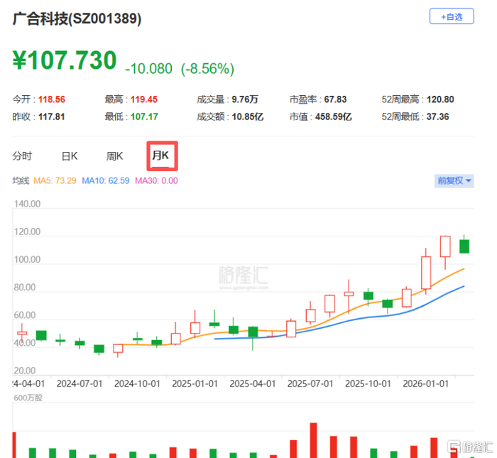 广合科技已于2024年4月在A股上市,证券代码:001389.SZ,截至2026年3月3日收盘,公司A股股价107.73元/股,市值为458.6亿元。