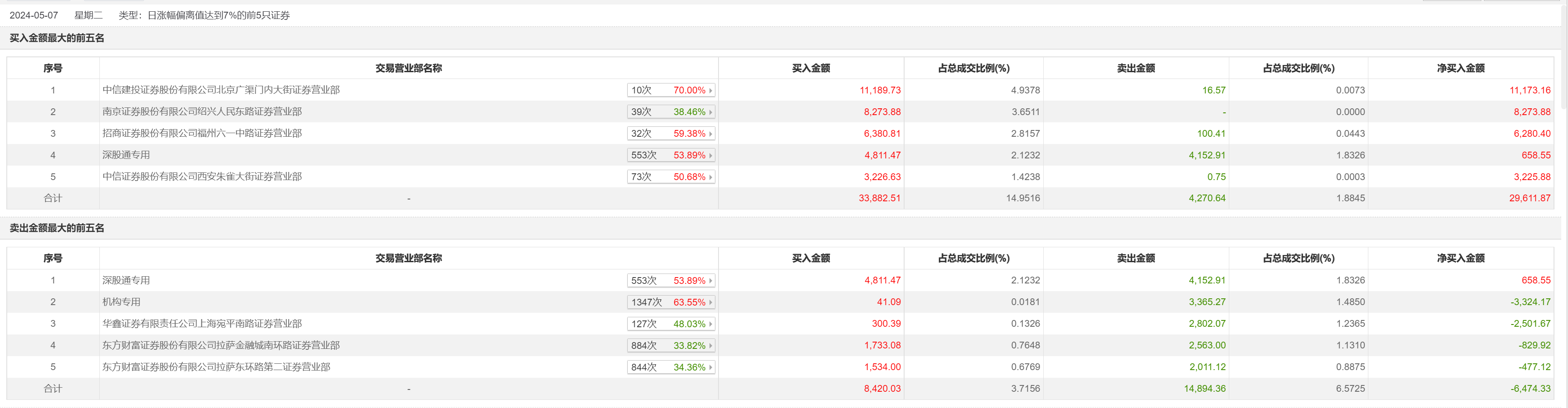 5月7日,宗申动力今日涨停,龙虎榜数据显示,上榜营业部席位全天成交5.25亿元,占当日总成交金额比例为23.17%。其中,买入金额为3.75亿元,卖出金额为1.5亿元,合计净买入2.25亿元。