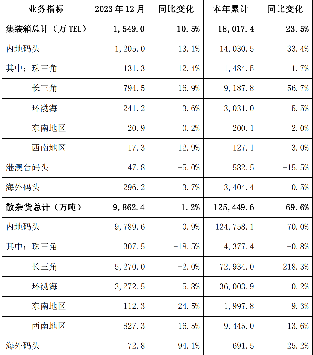 1月15日公告,12月份集装箱总计1549万TEU,同比增长10.5%;年度累计集装箱总计1.8亿TEU,同比增长23.5%。