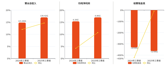 公司营业总收入为139.42亿元,在已披露的同业公司中排名第1,较去年同报告期营业总收入增加17.82亿元,实现5年连续上涨,同比较去年同期上涨14.65%。归母净利润为6.86亿元,在已披露的同业公司中排名第1,较去年同报告期归母净利润增加6636.91万元,实现5年连续上涨,同比较去年同期上涨10.71%。经营活动现金净流入为-12.06亿元。