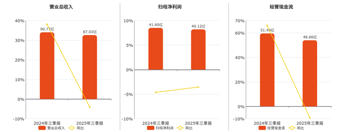 公司营业总收入为87.03亿元,较去年同报告期营业总收入减少3.74亿元,同比较去年同期下降4.12%。归母净利润为40.12亿元,较去年同报告期归母净利润减少1.48亿元,同比较去年同期下降3.56%。经营活动现金净流入为46.66亿元,较去年同报告期经营活动现金净流入减少4.82亿元,同比较去年同期下降9.37%。