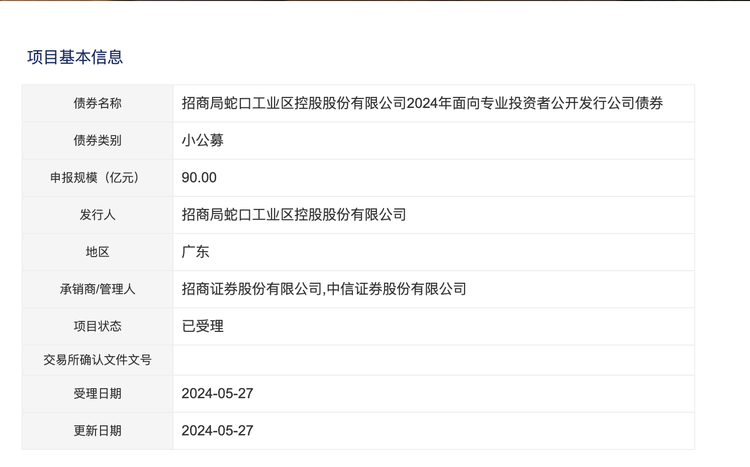 5月28日,澎湃新闻在深交所信息平台看到,招商局蛇口工业区控股股份有限公司2024年面向专业投资者公开发行的公司债券项目已于5月27日更新为“已受理”。