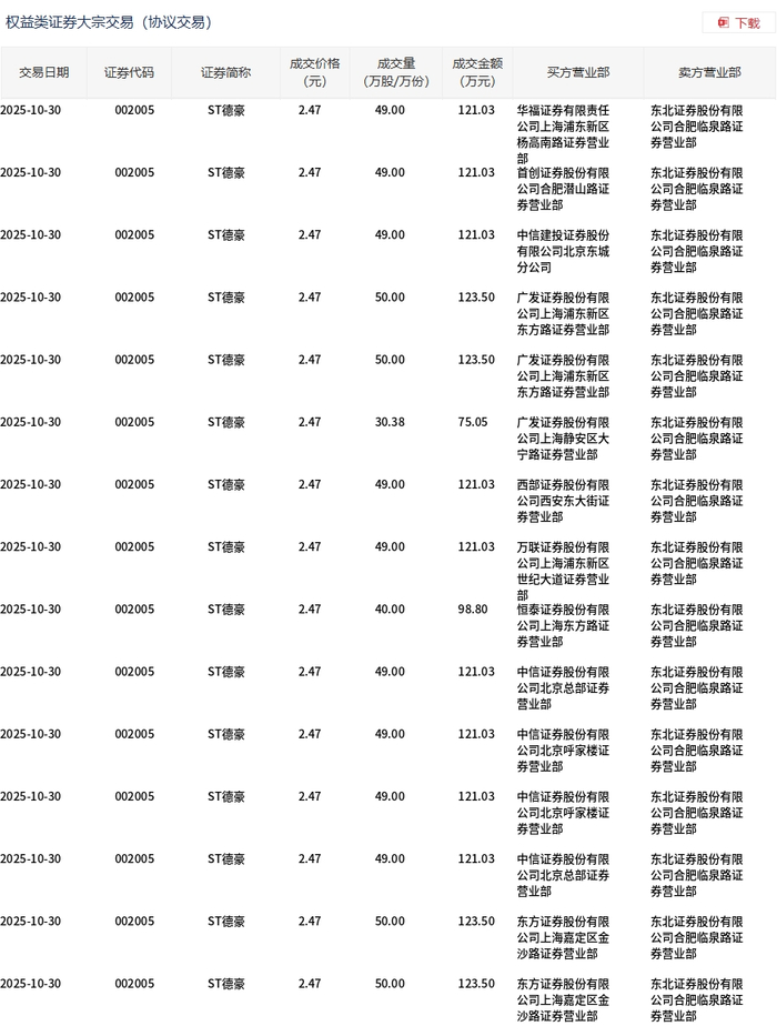 ST德豪今日大宗交易折价成交711.38万股,成交额1757.12万元