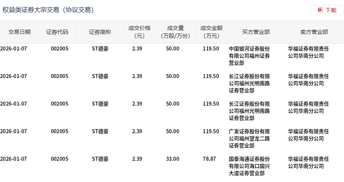 1月7日,ST德豪大宗交易成交233万股,成交额556.87万元,占当日总成交额的14.96%,成交价2.39元,较市场收盘价2.5元折价4.4%。
