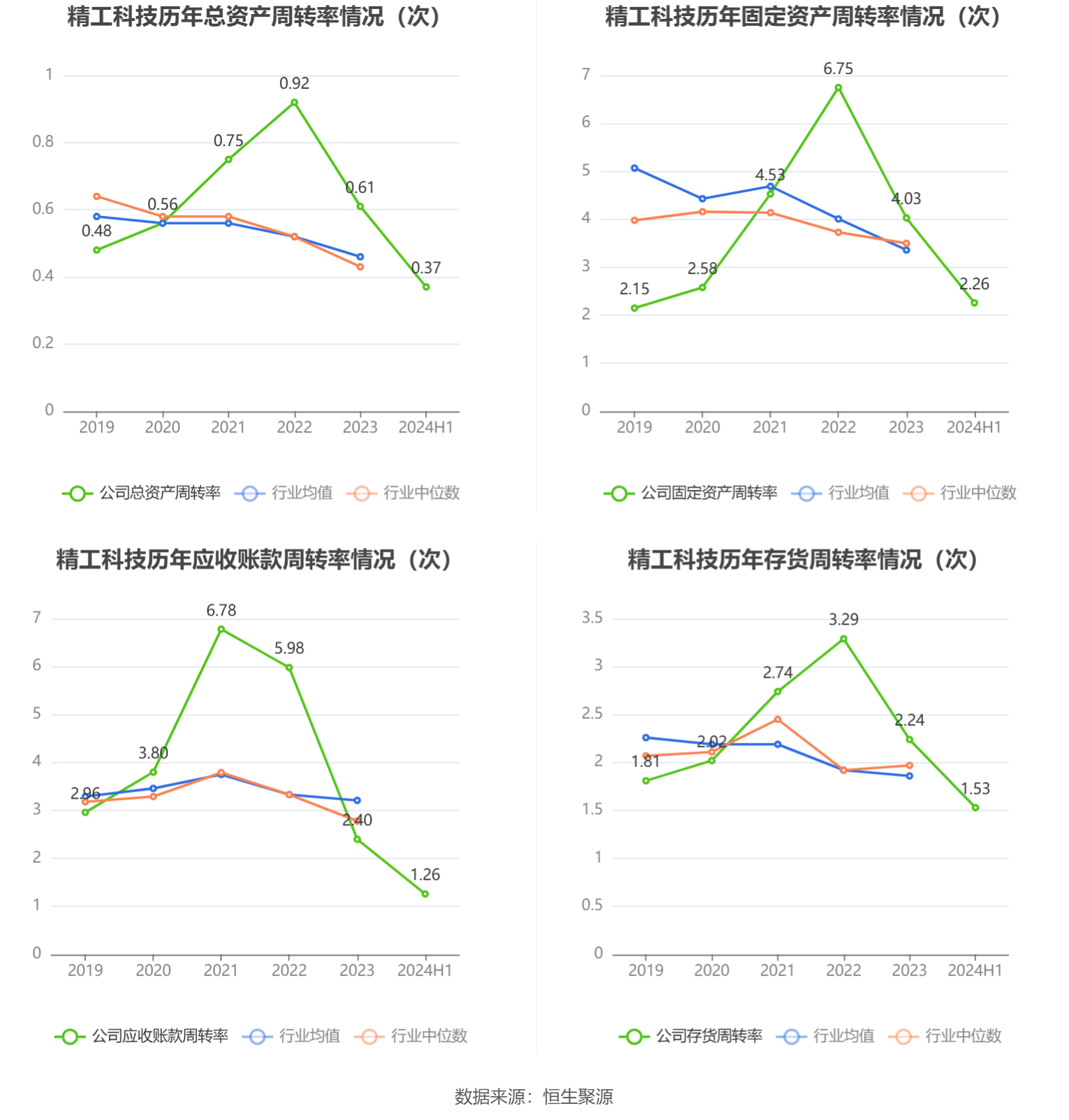 营运能力方面,2024年上半年,公司公司总资产周转率为0.37次,上年同期为0.34次(2023年上半年行业平均值为0.22次,公司位居同行业13/84);固定资产周转率为2.26次,上年同期为2.44次(2023年上半年行业平均值为1.64次,公司位居同行业21/84);公司应收账款周转率、存货周转率分别为1.26次、1.53次。