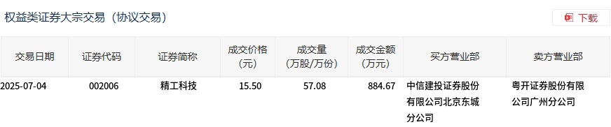 精工科技今日大宗交易折价成交57.08万股,成交额884.67万元