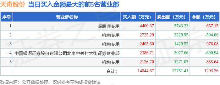 1月6日天奇股份(002009)龙虎榜数据:游资北京中关村上榜