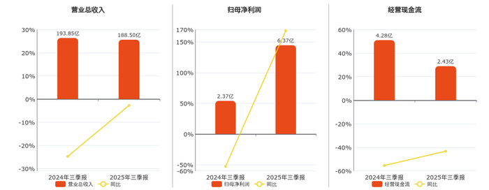 公司营业总收入为188.50亿元,较去年同报告期营业总收入减少5.36亿元,同比较去年同期下降2.76%。归母净利润为6.37亿元。经营活动现金净流入为2.43亿元,较去年同报告期经营活动现金净流入减少1.85亿元,同比较去年同期下降43.30%。