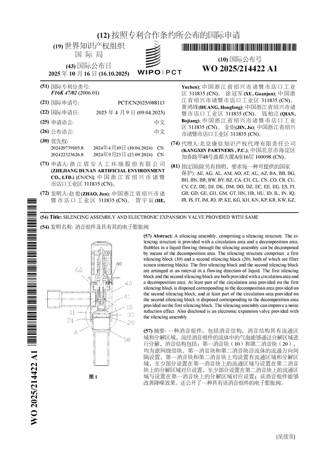 盾安环境公布国际专利申请:“消音组件及具有其的电子膨胀阀”