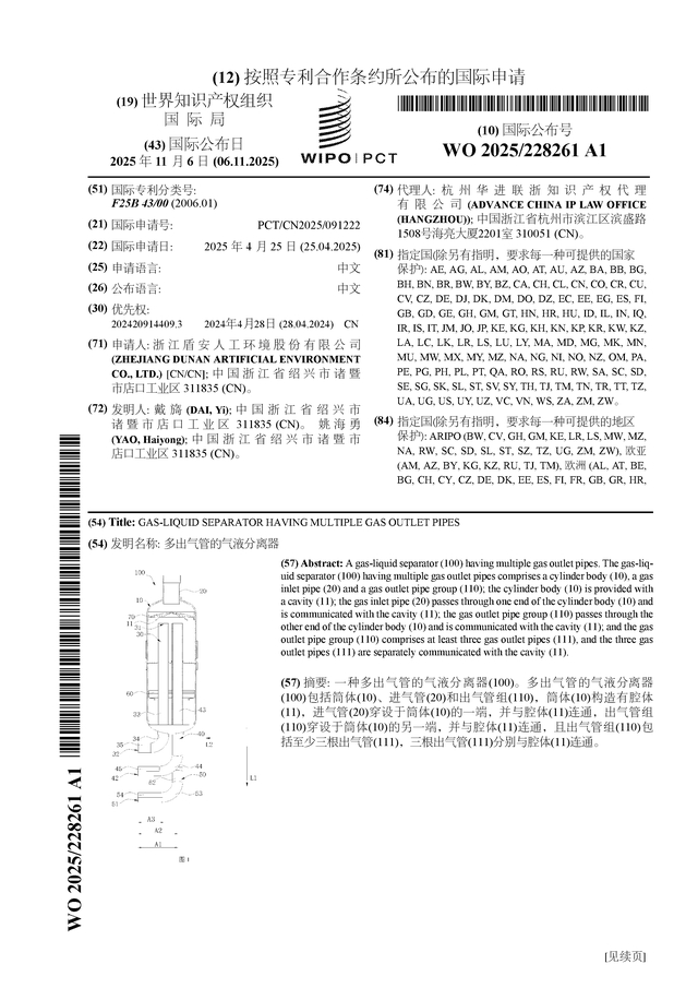 盾安环境公布国际专利申请:“多出气管的气液分离器”