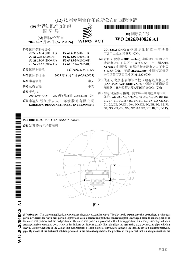 证券之星消息,根据企查查数据显示盾安环境(002011)公布了一项国际专利申请,专利名为“电子膨胀阀”,专利申请号为PCT/CN2025/113329,国际公布日为2026年2月26日。