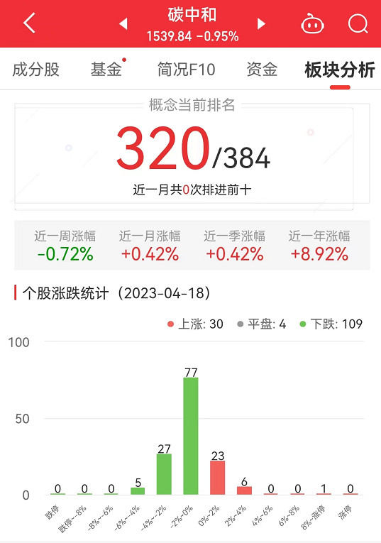 中国经济网北京4月18日讯 今日,碳中和板块整体跌幅0.95%,其中,30只股票上涨,4只股票平盘,109只股票下跌。