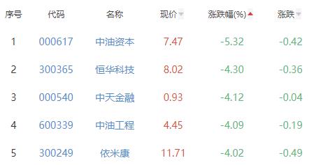 中油资本、恒华科技、中天金融、中油工程、依米康位列涨幅榜后五位,涨幅分别为-5.32%、-4.30%、-4.12%、-4.09%、-4.02%。