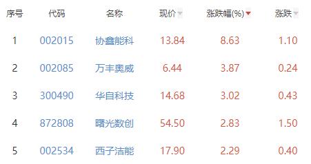 其中,协鑫能科、万丰奥威、华自科技、曙光数创、西子洁能位列板块涨幅前五位,涨幅分别为8.63%、3.87%、3.02%、2.83%、2.29%。