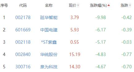 延华智能、中国电建、*ST紫鑫、华统股份、泉为科技位列涨幅榜后五位,涨幅分别为-9.98%、-6.17%、-5.17%、-4.83%、-4.67%。