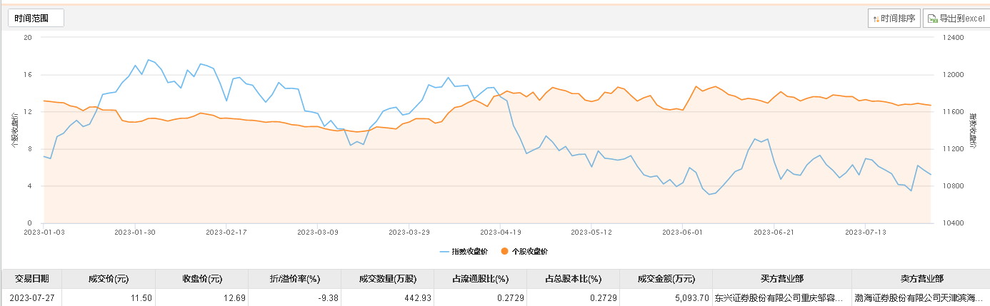 7月27日大宗交易成交442.93万股,成交额5093.7万元,占当日总成交额的28.76%,成交价11.5元,较市场收盘价12.69元折价9.38%。