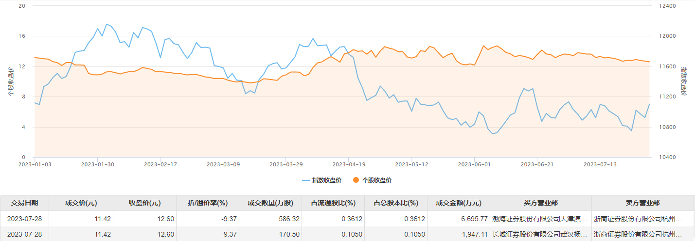 7月28日大宗交易成交756.82万股,成交额8642.88万元,占当日总成交额的31.41%,成交价11.42元,较市场收盘价12.6元折价9.37%。