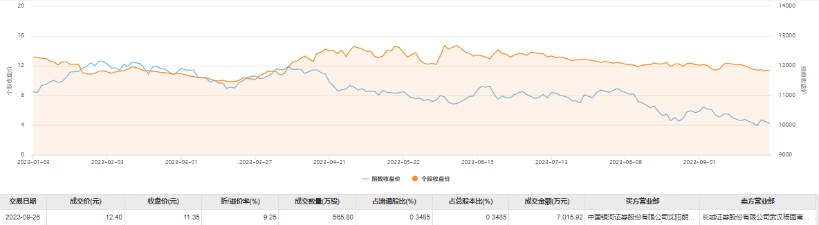 9月26日大宗交易成交565.8万股,成交额7015.92万元,占当日总成交额的37.52%,成交价12.4元,较市场收盘价11.35元溢价9.25%。