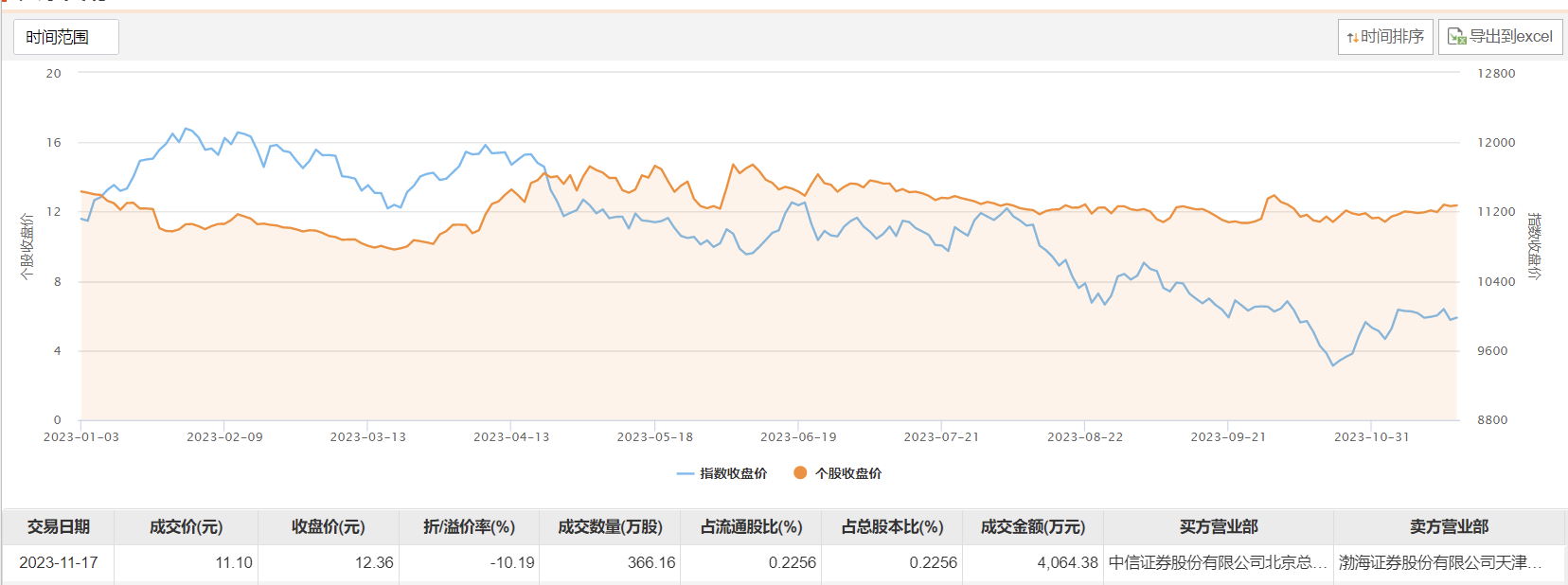 今日大宗交易成交366.16万股,成交额4064.38万元,占当日总成交额的14.84%,成交价11.1元,较市场收盘价折价10.19%。