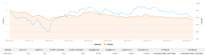 6月24日大宗交易成交335万股,成交额2499.1万元,占当日总成交额的18.56%,成交价7.46元,较市场收盘价7.94元折价6.05%。