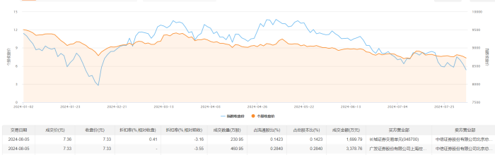协鑫能科8月5日大宗交易成交691.9万股,成交额5078.55万元,占当日总成交额的27.93%,成交均价7.34元,较市场收盘价7.33元溢价0.14%,其中最高成交价7.36元,最低成交价7.33元。