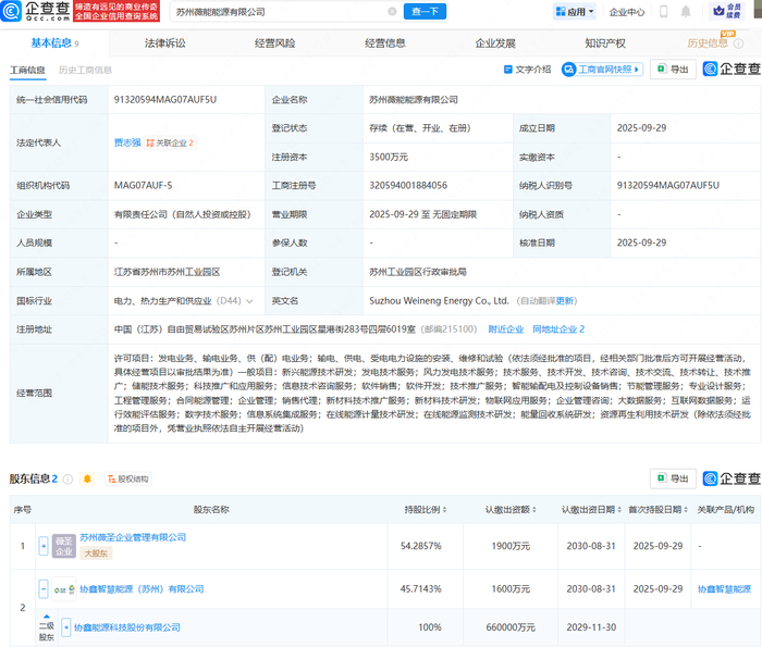 企查查APP显示,近日,苏州薇能能源有限公司成立,法定代表人为贾志强,注册资本为3500万元,经营范围包含:发电业务、输电业务、供(配)电业务;发电技术服务;储能技术服务;能量回收系统研发等。企查查股权穿透显示,该公司由苏州薇圣企业管理有限公司、协鑫能科(002015)全资子公司协鑫智慧能源(苏州)有限公司共同持股。