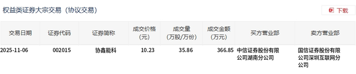 11月6日,协鑫能科大宗交易成交35.86万股,成交额366.85万元,占当日总成交额的0.64%,成交价10.23元,较市场收盘价11.11元折价7.92%。