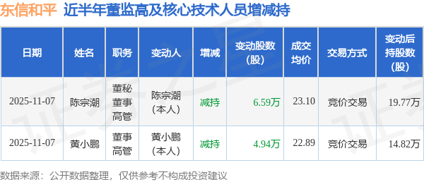 证券之星消息,根据11月10日市场公开信息、上市公司公告及交易所披露数据整理,东信和平(002017)最新董监高及相关人员股份变动情况:2025年11月7日公司董秘,董事,高管陈宗潮、董事,高管黄小鹏共减持公司股份11.53万股,占公司总股本为0.0199%。变动期间公司股价下跌2.7%,11月7日当日收盘报22.73元。