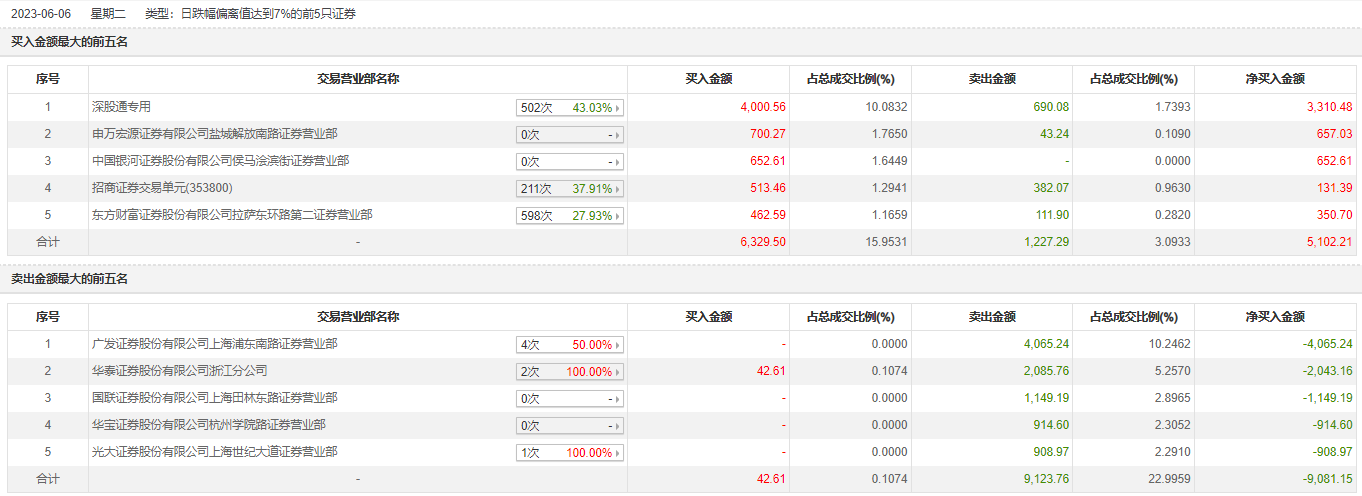 具体来看,广发证券上海浦东南路证券营业部、华泰证券浙江分公司分别卖出4065.24万元、2085.76万元;深股通专用、申万宏源证券有限公司盐城解放南路证券营业部分别买入4000.56万元、700.27万元。