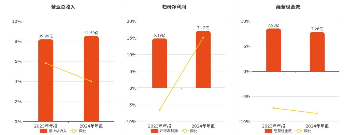 公司营业总收入为41.59亿元。归母净利润为7.12亿元。经营活动现金净流入为7.26亿元,较去年同报告期经营活动现金净流入减少6667.70万元,同比较去年同期下降8.41%。