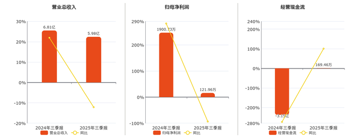 公司营业总收入为5.98亿元,在已披露的同业公司中排名第90,较去年同报告期营业总收入减少8270.47万元,同比较去年同期下降12.14%。归母净利润为121.96万元,在已披露的同业公司中排名第141,较去年同报告期归母净利润减少1778.77万元,同比较去年同期下降93.58%。经营活动现金净流入为169.46万元,在已披露的同业公司中排名第108,较去年同报告期经营活动现金净流入增加3.17亿元。