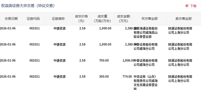 1月6日,中捷资源大宗交易成交3000万股,成交额7740万元,占当日总成交额的36.32%,成交价2.58元,较市场收盘价2.63元折价1.9%。