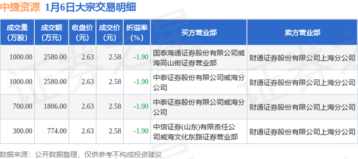 证券之星消息,1月6日中捷资源发生大宗交易,交易数据如下: