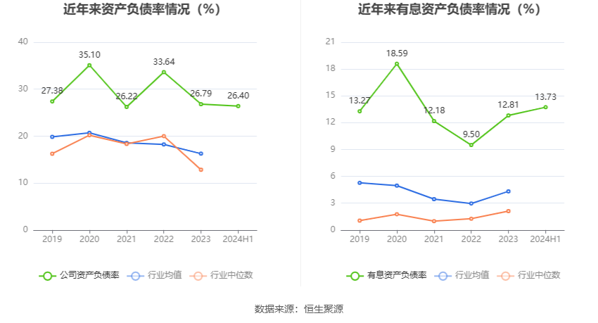 在偿债能力方面,公司2024年上半年末资产负债率为26.40%,相比上年末下降0.39个百分点;有息资产负债率为13.73%,相比上年末上升0.92个百分点。