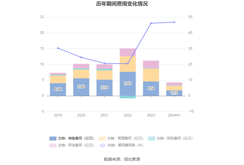 2024年上半年,公司期间费用为4.26亿元,较上年同期减少1.34亿元;但期间费用率为46.84%,较上年同期上升6.78个百分点。其中,销售费用同比下降32.06%,管理费用同比下降17.85%,研发费用同比下降25.08%,财务费用同比增长654.68%。