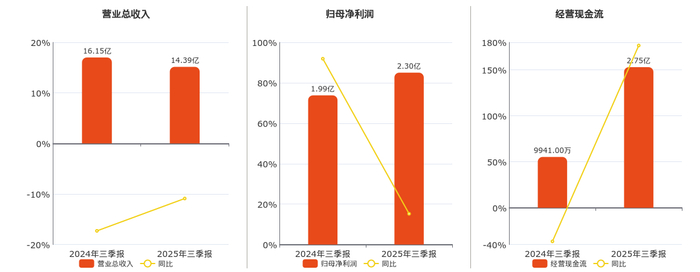 公司营业总收入为14.39亿元,较去年同报告期营业总收入减少1.76亿元,同比较去年同期下降10.89%。归母净利润为2.30亿元。经营活动现金净流入为2.75亿元。