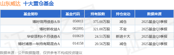 持有山东威达最多的基金为博时信用债券A/B,目前规模为47.36亿元,最新净值3.682(10月28日),较上一交易日下跌0.87%,近一年上涨18.77%。该基金现任基金经理为过钧。
