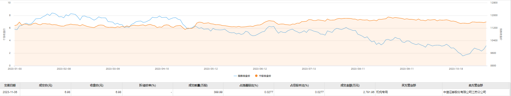 今日大宗交易成交399.99万股,成交额2791.96万元,占当日总成交额的4.11%,成交价6.98元,较市场收盘价持平。