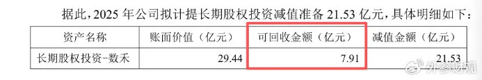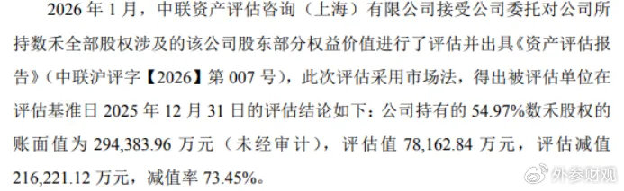 根据2026年1月24日的资产评估报告,分众持数禾科技的54.97%股权,账面价值高达29.44亿元,而评估价值却俯冲到了7.82亿元,减值幅度高达惊人的73.45%。