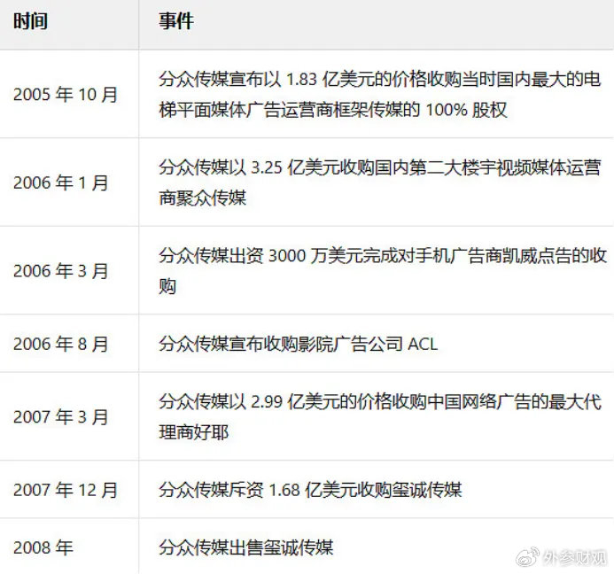 在2005年至2007年,分众为了给华尔街带去所谓的“生活圈媒体”新故事,便疯狂收购涉及手机广告、互联网广告等领域的60余家公司,部分信息如下图所示: